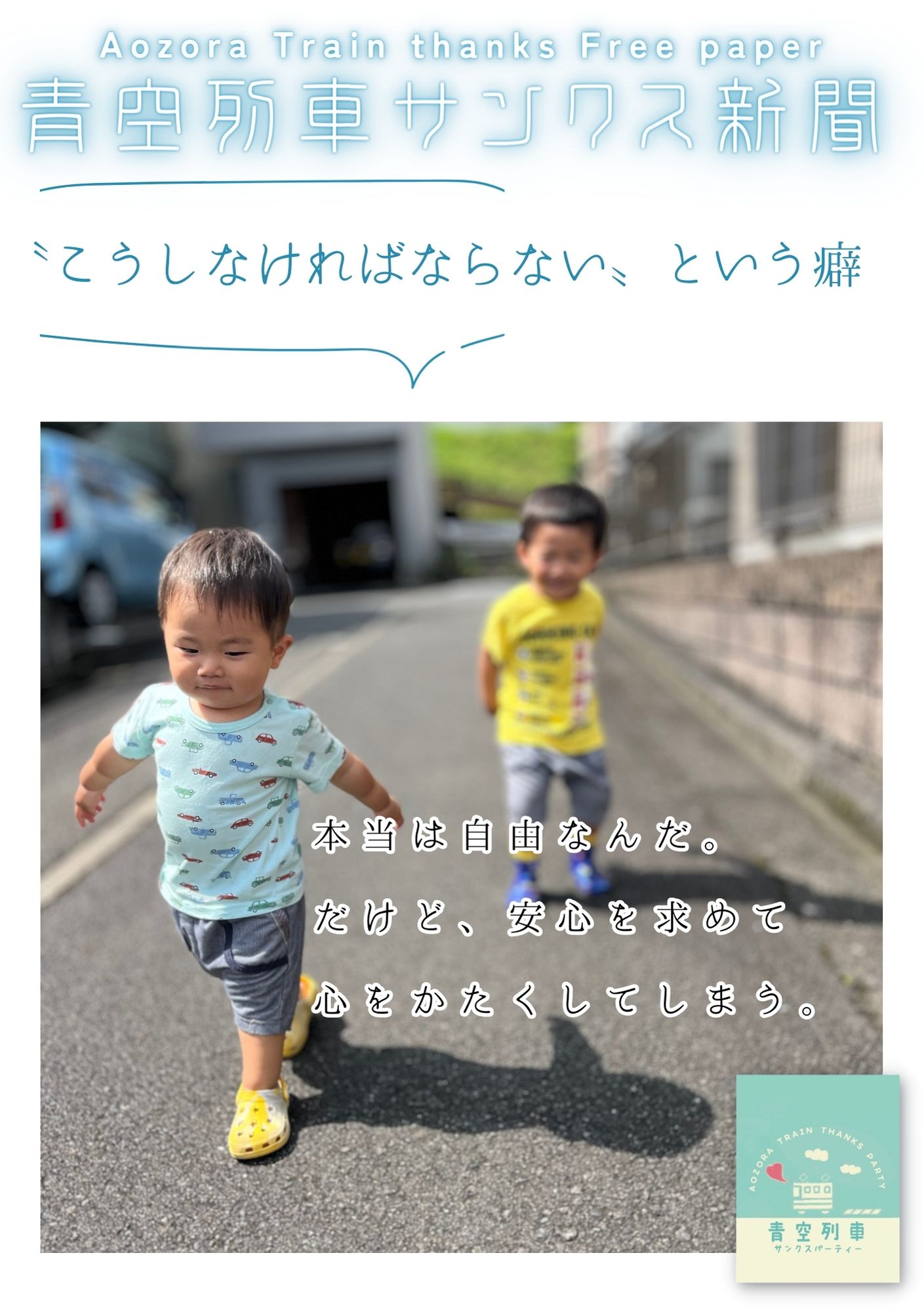 HOME > 手作り本 > 青空列車サンクス新聞 > 青空列車サンクス新聞 「〝こうしなければならない〟という癖」青空列車サンクス新聞 vol.06 2023年9月6日 本当は決められたレールなんてないのかもしれない。 青空列車新聞 2023.7月号ダウンロード Twitter Share Pocket Hatena LINE URLコピー -青空列車サンクス新聞