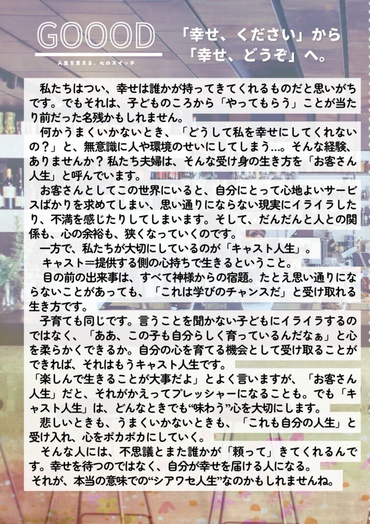 💡「幸せにしてもらう人生」から「幸せを届ける人生」へ
