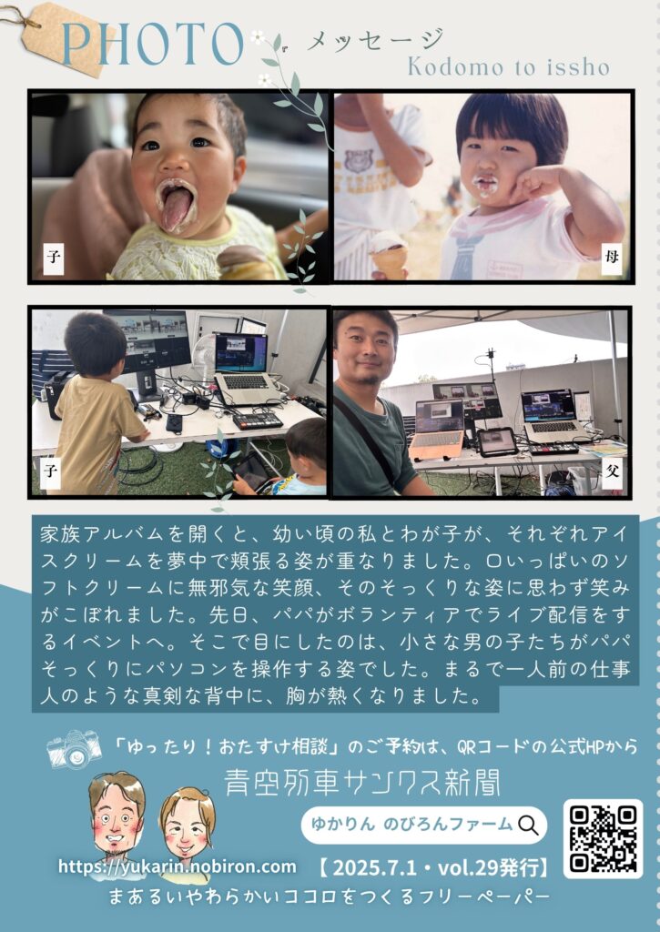先日、わが家で大切に読んでいる**「青空列車サンクス新聞」**の最新号([2025.7.1・vol.29発行])を読みました。育児や日常に「ありがとう」を乗せて、心をふわっと温かくしてくれるフリーペーパーです。