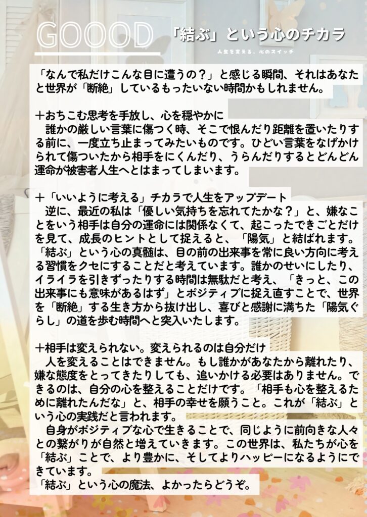 この言葉は、とてもシンプルですが力強いですよね。相手の行動ではなく、**「自分が相手を丸ごと受け止め、幸せを願うこと」こそが、自分自身を豊かにし、人との良い「結び」**を生み出す秘訣なんですね。