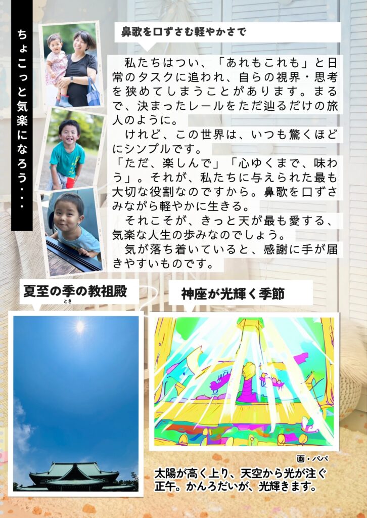 物理学でいう素粒子のように、私たち人間も、感情も、見えないレベルで深くつながっていて、心が元気に生み出すエネルギーが、周りの人や世界を明るく照らしてくれる、というメッセージに深く共感しました。日常のイライラも、この「陽気エネルギー」で乗り越えていきたいな、と感じます。